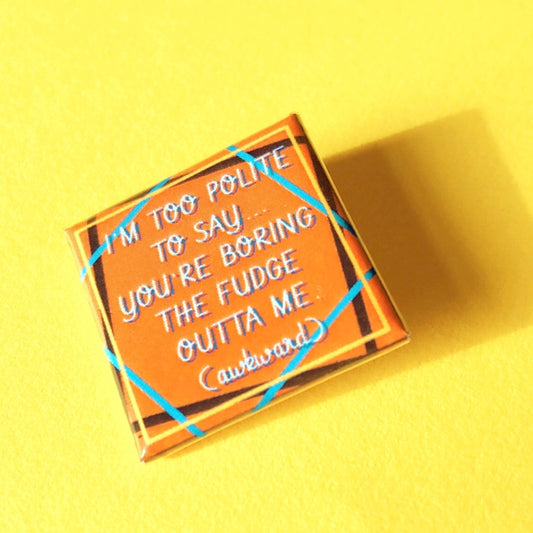 "I'm Too Polite To Say You're Boring the Fudge Outta Me (awkward)" Orange Pin Badge