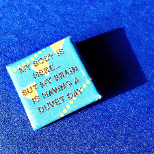 "My Body is Here... But My Brain is Having A Duvet Day" Blue Pin Badge